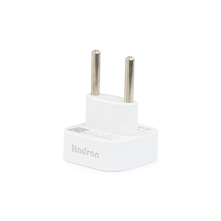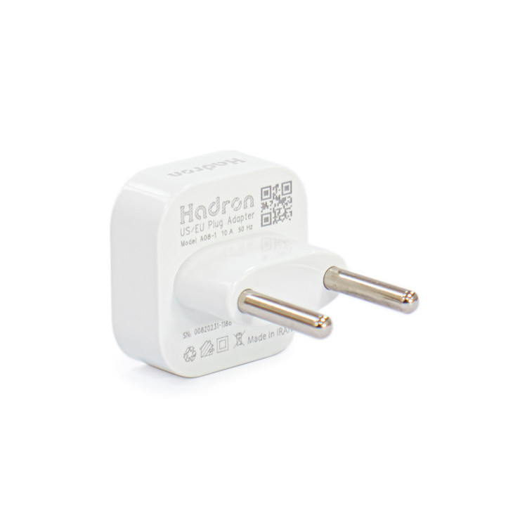 تبدیل دو به دو هادرون مدل A08 وسیلهای جهت اتصال دستگاههایی با سوکتهای برق مدل امریکایی به پریز ایرانی است. ابعاد بسیار کوچک این محصول در کنار زیبایی چشمگیر و همچنین استحکام و اتصال قوی به سوکت از جمله مزایای این محصول است. زمانی که دوشاخه برق را به پریز متصل مینمایید به دلیل خاصیت فنری پریز و لرزشهای بسیار اندک دستتان ( در حد صدم میلیمتر ) باعث میشود ارتباط دوشاخه و پریز برای ده ها مرتبه قطع و وصل گردد و این موضوع موجب میشود دهها جرقه پیاپی در کسری از ثانیه ایجاد شود و به دلیل خاصیت سلفی ( مغناطیسی ) اندکی که در سیمها وجود دارد و پدیده رزونانس، در مواردی ولتاژ میتواند برای کسری از ثانیه بالا رفته و به دستگاه آسیب بزند. مبدل برق هادرون مدل A08-1 اتصال محکمی بین دوشاخه و سوکت ایجاد میکند که مانع از جابهجایی دوشاخه میشود. ولتاژ کاری این مبدل تا 250 ولت متناوب و حداکثر جریان انتقالی آن 10 آمپر است.